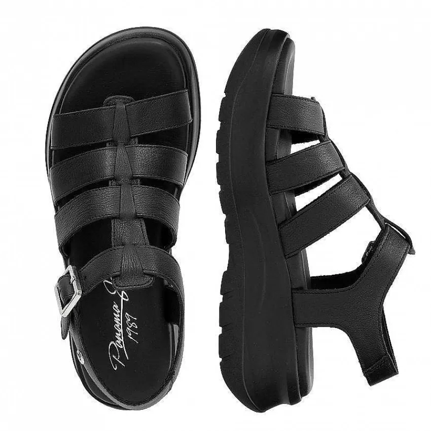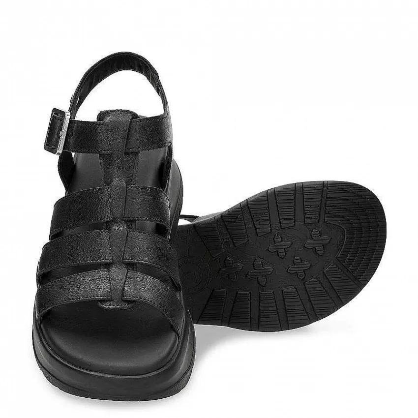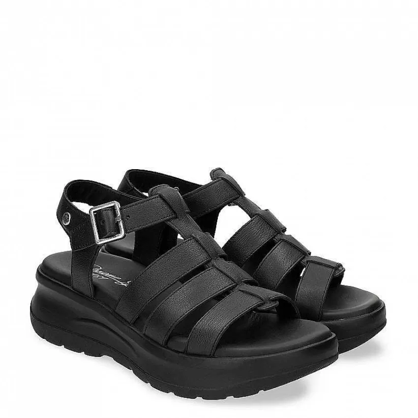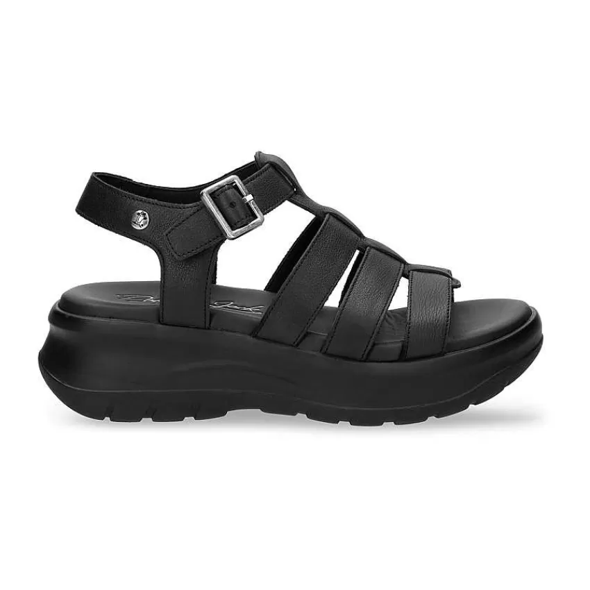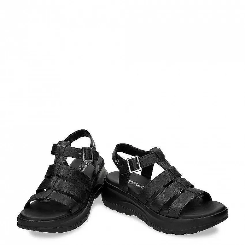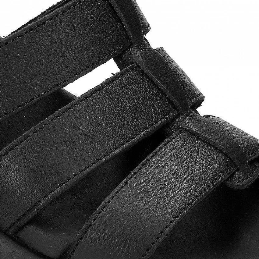 Sandalia Plana MujerCierre Con Hebilla.Piel Napa Negro Impermeable.Forro De Piel.